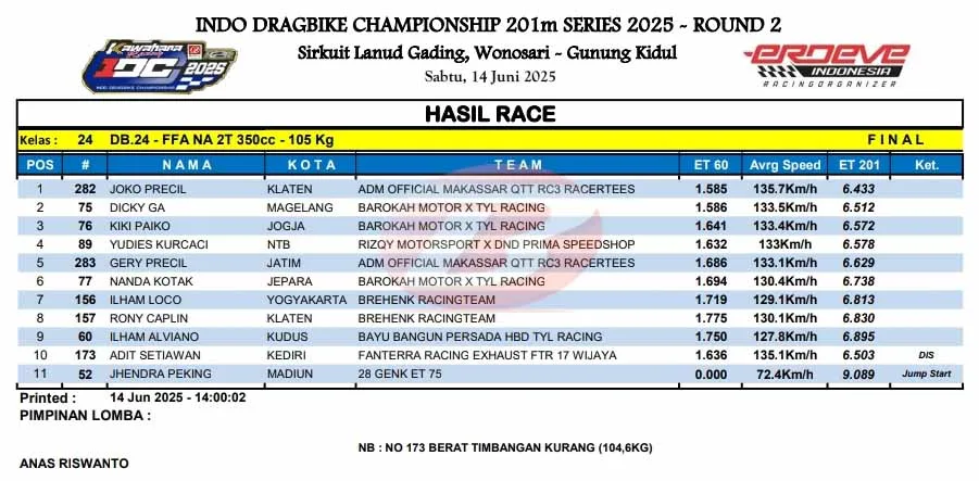 ”Karakter mesin sudah paham, dan tadi juga saya start cukup baik. Alhamdulillah bisa berikan podium juara di kelas FFA 2 Tak ini,” kata Joko yang merupakan jawara bertahan di ajang IDC ini.