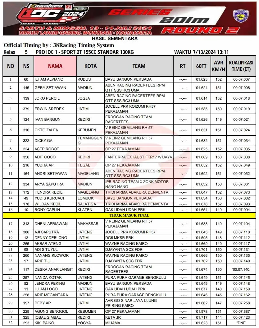 BalapMotor.Net – Putaran kedua Kawahara Djava K2R IDC Drag Bike Championship 2024 berlangsung di sirkuit NP. Lanud Gading, Wonosari, Yogyakarta (13 Juli) kembali mementaskan petarung top Indonesia.