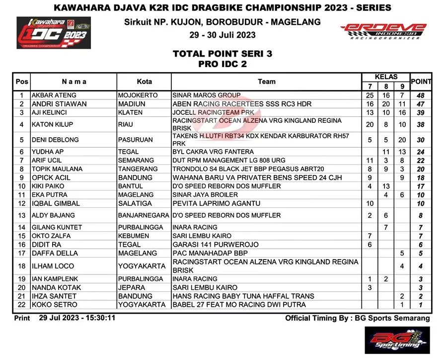 BalapMotor.Net – Kawahara Djava K2R IDC Drag Bike kategori kelas poin Pro IDC 2 sudah langsung menjalankan babak final hari ini. Juara umum untuk putaran ketiga yang berlangsung di sirkuit NP. Kujon, Borobudur ini pun sudah diketahui.