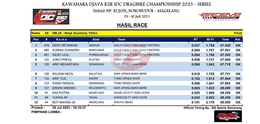 Tampil begitu dominan dengan menyapu bersih podium tiga besar terbaik. Di posisi pertama ada Gery Setiawan, lanjut Kurnia Chandra dan Dicky Ucil di posisi belakangnya. Ketiganya konsisten 7,5 detik.
