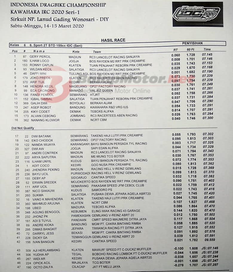 IDC Wonosari 2020: Ninja STD Diserbu 47 Starter, Gery Precil Tercepat 7,145 Detik!