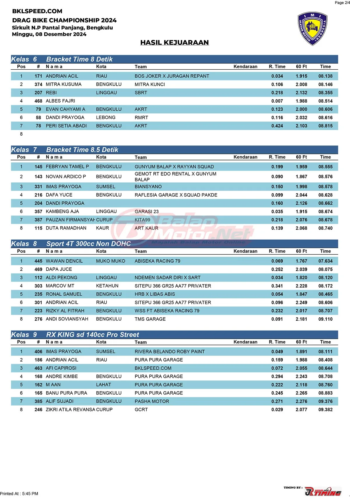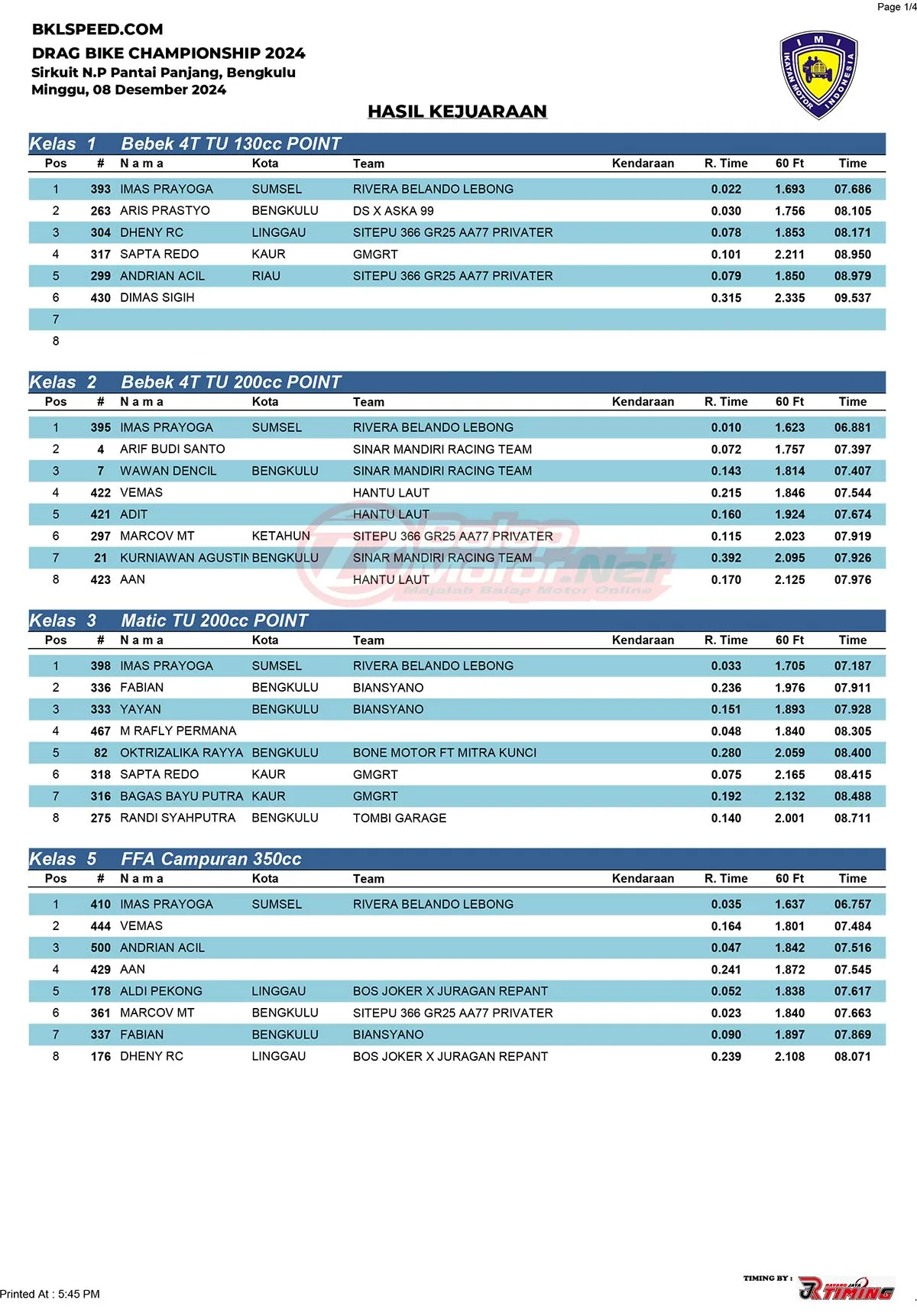 BalapMotor.Net – Gelaran BKL Speed Drag Bike 201M Championship yang berlangsung pada 8 Desember 2024 di Sirkuit N.P Komplek Pantai Panjang, Bengkulu, menjadi panggung kemenangan gemilang bagi Imas Prayoga. Pembalap asal Muntok, Bangka Belitung, yang memperkuat tim Rivera Belando Lebong asal Palembang ini sukses meraih juara umum kategori Open dengan hasil yang mengesankan.