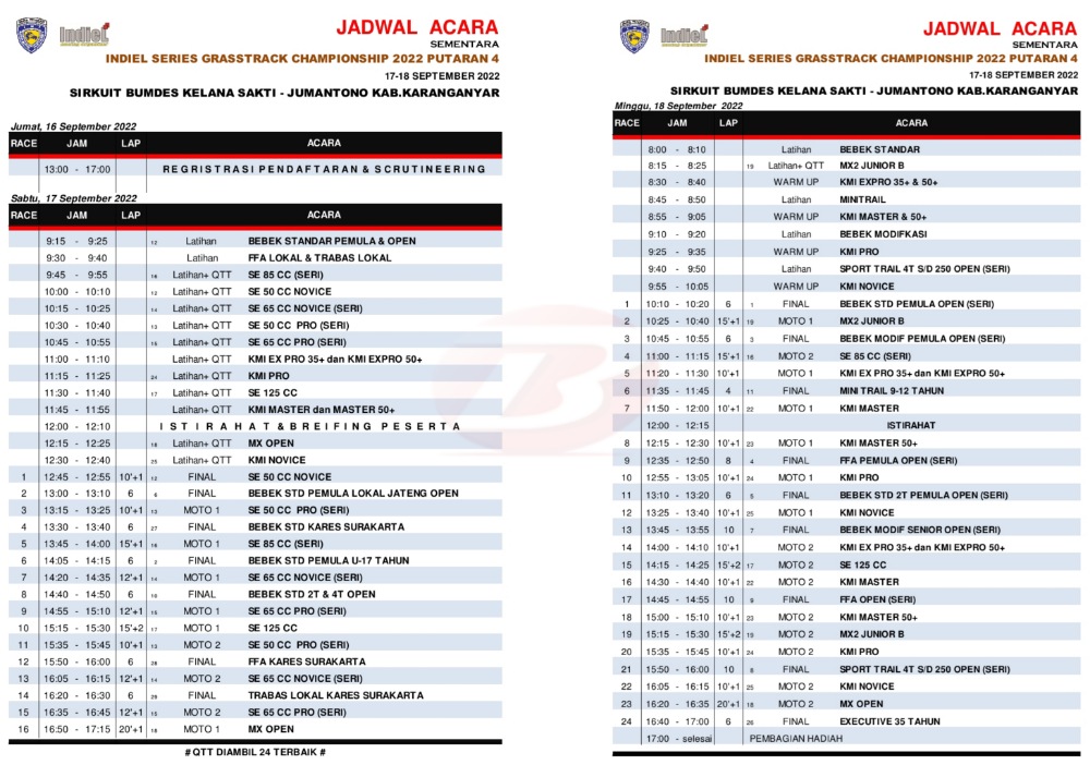 Seperti biasa, Indiel Racing Organizer telah melakukan penyusunan jadwal kegiatan. Dari hari Sabtu beberapa kelas langsung final maupun Moto1 dan Moto2. Jadi, pertarungan seru sudah akan berlangsung di hari pertama.