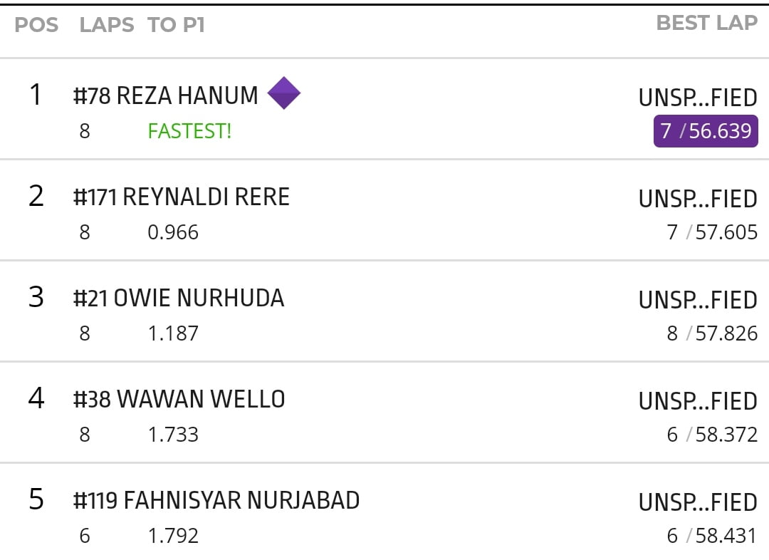 Hanum dengan Yamaha F1ZR Fokus Kim’s Racing Tegal secara luar biasa mencatatkan waktu terbaik 56,639 detik. Torehan tersebut pun mampu meningalkan Reynaldi Pradana di posisi kedua dengan kisaran 1 detik.