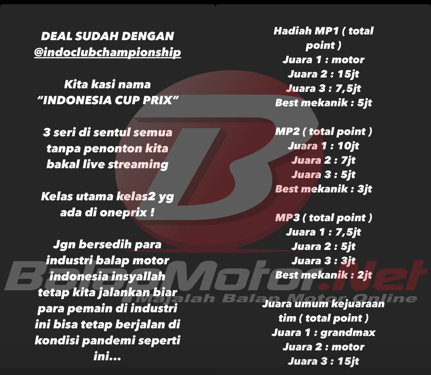 BalapMotor.Net – Karena memang ditujukan sebagai pengganti gelaran Kejurnas Oneprix yang resmi dibatalkan, gelaran Indonesia Cup Prix bakalan memberikan hadiah yang istimewa. Jadi selain bakal live streaming, juga hadiahnya ga tanggung-tanggung.