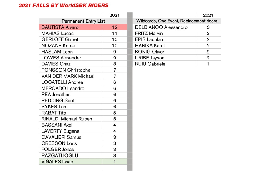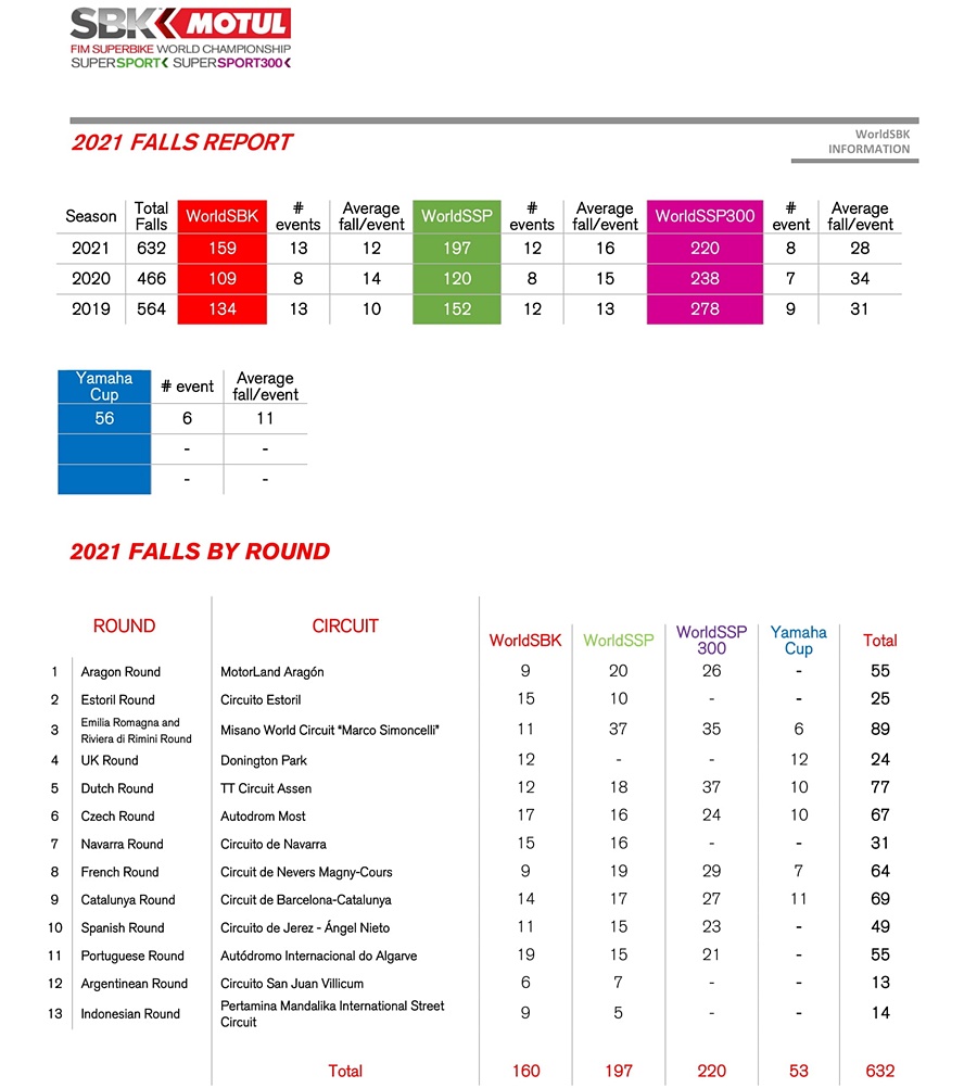 Di kelas WorldSBK terjadi kecelakaan sebanyak 159 kali, sementara WorldSSP 197 kali dan WorldSSP300 mencatat 220 kali. Khusus Superbike, tahun ini presentasinya sedikit menurun dari tahun sebelumnya.