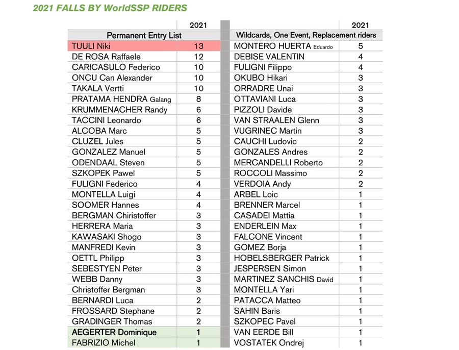 Namun yang terbanyak adalah Niki Tuuli di kelas WorldSSP yang mencatat 13 kali kecelakaan. Sedangkan sirkuit yang paling sering membuat pembalap jatuh yaitu lintasan Misano San Marino dengan 89 kali insiden.