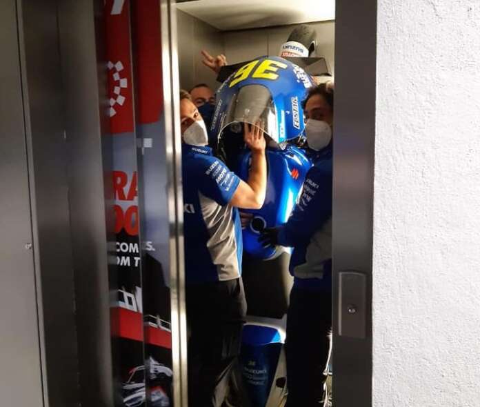 Karena tidak mungkin menggunakan tangga, jadi motor tersebut diangkut lewat lift. Itu sebabnya, kru tim Suzuki MotoGP sampai gotong-gotong motor MotoGP Suzuki GSX-RR, Kalex Triumph 765 cc, KTM RC250GP pakai lift.