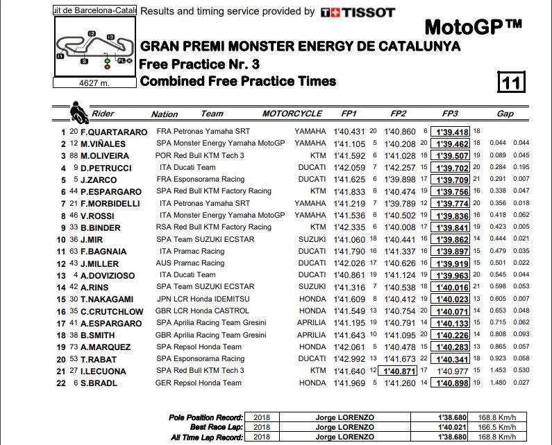 Kejutan diberikan oleh Miguel Oliveira dan Danilo Petrucci, mereka yang di hari pertama sempat terseok-seok, Kini mereka meempati posisi kek 3 dan 4 waktu gabungan FP1 hingga FP3.