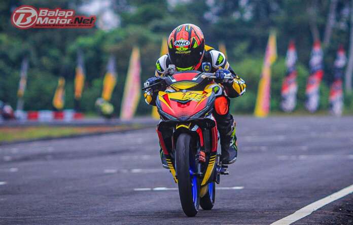 BalapMotor.Net – Rider belia asal Jambi yang membela tim Privater HRCT yaitu Farel Valentino tak tertandingi dalam dua race kelas Bebek 4T 150cc Injeksi (Rookie) pada gelaran Kejurnas Motoprix Region A Sumatera putaran ke-4 yang berlangsung di sirkuit Zabaq Nasional Sirkuit, Tanjung Jabung Timur, Jambi (4-5/12).