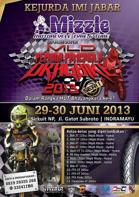 BAN BELAKANG WAJIB MEMAKAI BAN MIZZLE TYPE HYDRA UKURAN 60/80/17 DIKARENAKAN ADA HADIAH TAMBAHAN DARI SPONSHOR BAN MIZZLE DISAMPING HADIAH UTAMA 1 UNIT SEPEDA MOTOR UNTUK JUARA I SERTA Rp 3.000.000,- DAN Rp 2.000.000,- UNTUK JUARA II DAN JUARA III
