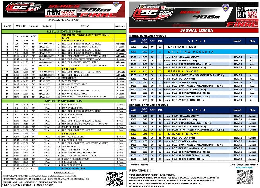 Sabtu fokus kualifikasi Pro IDC 1 dan final Pro IDC 2. Juga ada kelas supporting yang tak kalah seru. Di sisi lain untuk kategori 402m, heat pertama akan dijalankan pada hari Sabtu.