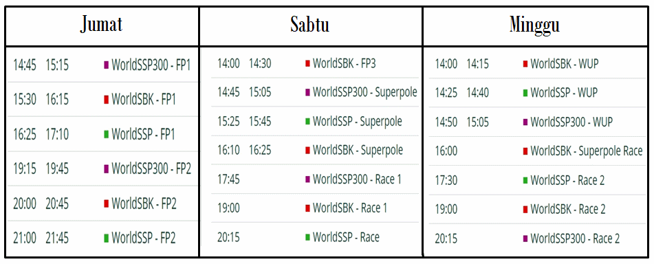 Dalam balapan akhir pekan ini semua kelas akan dipertandingkan, dari WorldSSP 300cc, WorldSSP 600cc dan WorldSBK. Acara akan dimulai pada hari Jumat dengan dua sesi latihan bebas. Lanjut kualifikasi dan Race pertama untuk hari Sabtu dan Race kedua di hari Minggu.