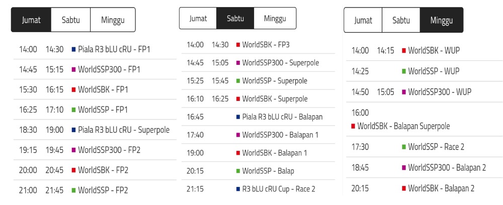 WorldSSP, WorldSSP 600, WorldSBK hingga piala Yamaha R3 semua akan bertanding. Untuk jadwal Race 1 kelas utama Superbike akan berlangsung mulai pukul 19.00 wib (Sabtu) sementara pada Race 2 mulai 20.15 wib (Minggu).