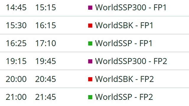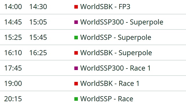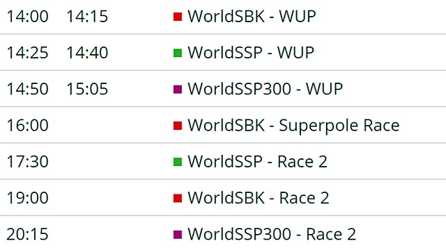Seperti biasa, acara akan dimulai pada hari Jumat dengan dua sesi latihan bebas (FP1-FP2). Lanjut dihari Sabtu ada Superpole sekaligus Race 1. Khusus Superbike hari minggu ada Superpole Race sebelum semua kelas menjalani Race 2.