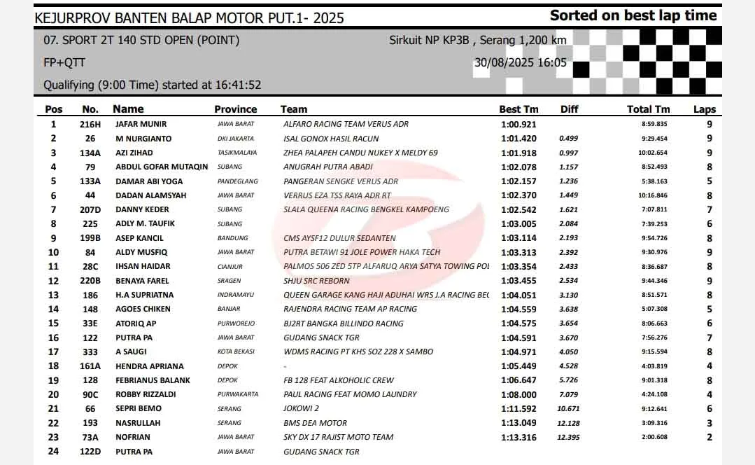 BalapMotor.Net – Jafar Munir menjadi pembalap tercepat pada sesi kualifikasi Sport 2T STD 140cc Kejurprov Banten Seri 1 yang berlangsung di sirkuit NP. KP3B Serang.