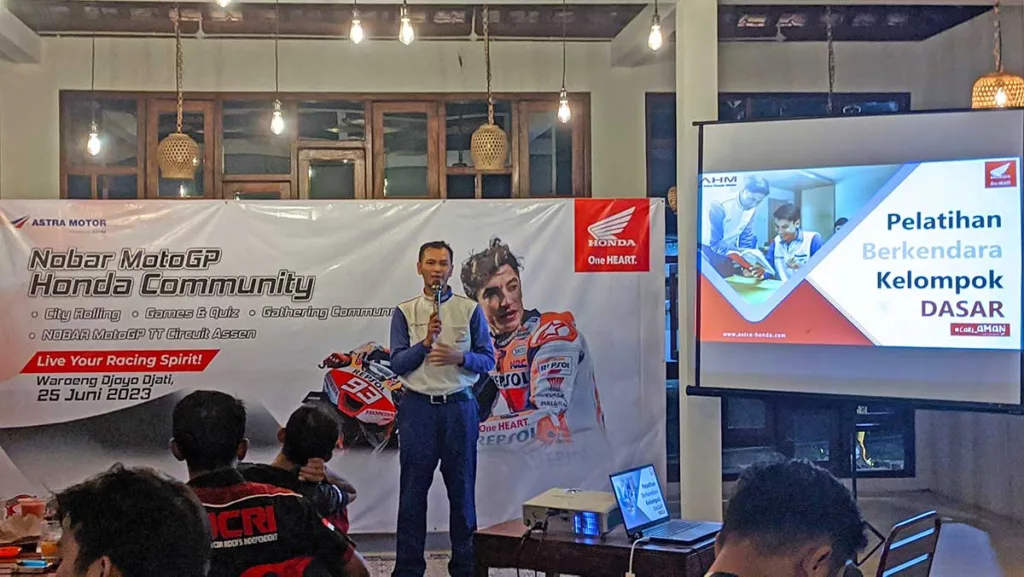 Sesampai di lokasi Nonton Bareng MotoGP, peserta diajak untuk mengikuti refreshment tentang keanggotaan Honda Community ID (HCID), aktivasi program Liga MotoGP, berbagi agenda komunitas motor Honda, rencana CBR Track Day 2023, hingga edukasi safety riding, nonton bareng MotoGP Assen, hingga ditutup dengan kuis interaktif berhadiah.