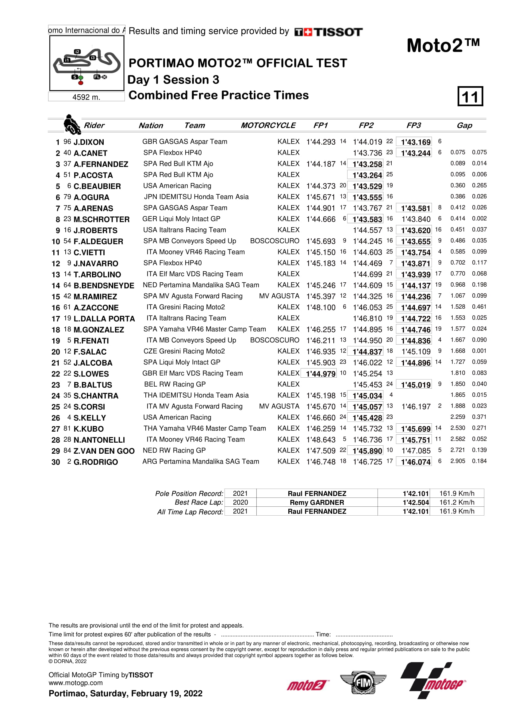Jake Dixon yang pada musim sebelumnya membela tim Petronas Sprinta dan sempat dua kali tampil di kelas premier MotoGP jadi pembalap pengganti mampu mencetak best time 1 menit 43.169 detik di trek Algarve. Time tersebut diraihnya pada sesi sore (FP3).