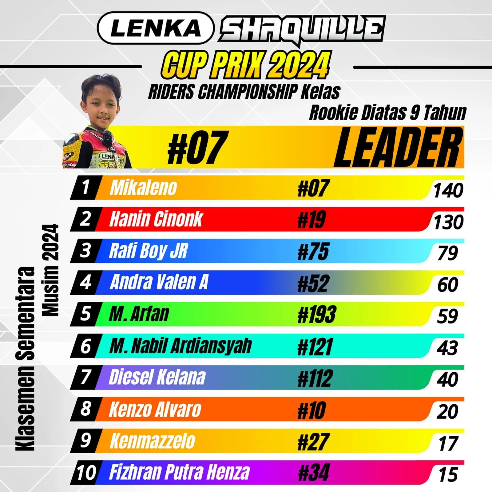 Keduanya hanya terpaut 10 poin dimana Mikaleno memimpin dengan perolehan poin sebanyak 140, sedangkan Hanin Cinonk kedua dengan perolehan poin 130. Tentunya, dua race pada ronde final nanti menjadi penentu.