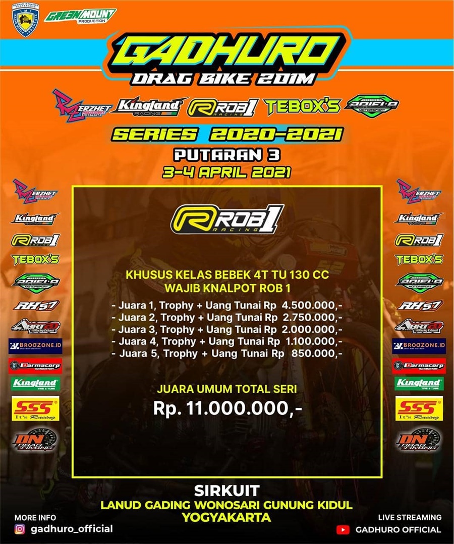 - Hadiah uang lebih besar di kelas wajib knalpot ROB1 (bebek 4T TU 130cc)