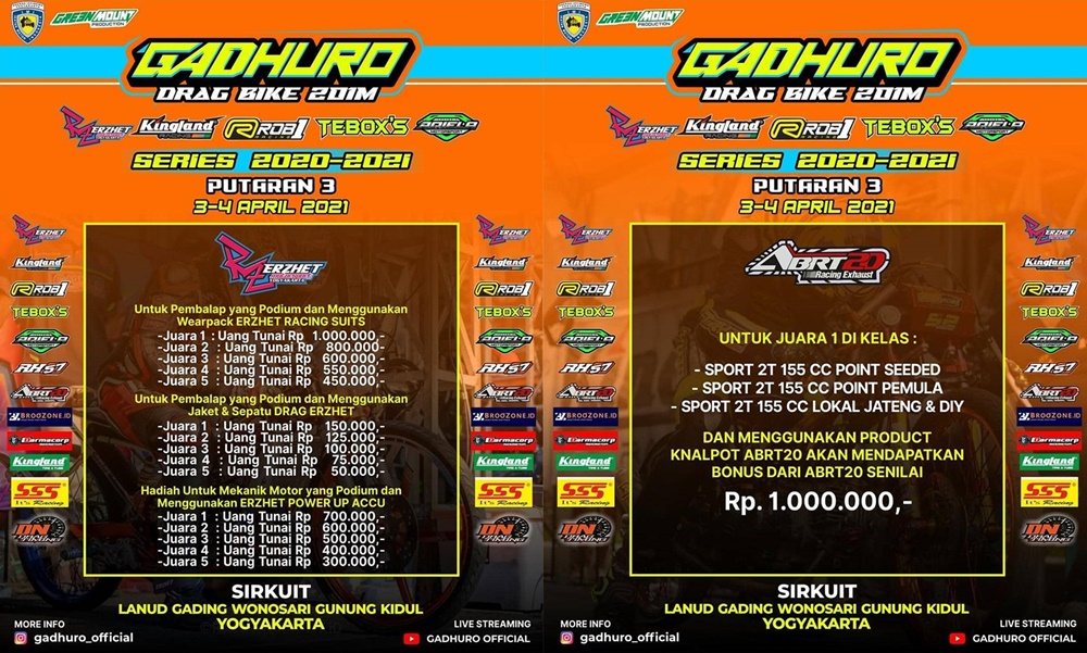 - Hadiah 1 juta untuk kelas Sport 2T STD 155cc di tiga kelas sekaligus pengguna knalpot ABRT20