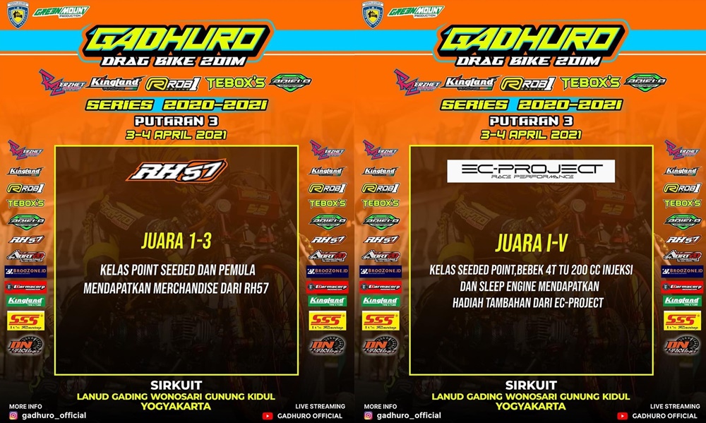 BalapMotor.Net – Jangan sampai kelewatan ajang bergengsi kejuaraan balap lurus Gadhuro Drag Bike Seri 3 yang rencana akan berlangsung di Lanud Gading, Wonosari akhir pekan ini (3-4 April).