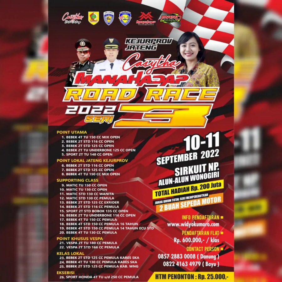 BalapMotor.Net – Alun-Alun Giri Krida Bakti Wonogiri bakalan menjadi laga lanjutan Kejurprov Jateng Casytha Manahadap musim 2022 pada akhir pekan ini (10-11/9). Setelah Pati dan Boyolali, Wonogiri bakalan menjadi tempat bertarungnya para rider dan tim ganas dari Jateng dan tentunya luar Jateng.