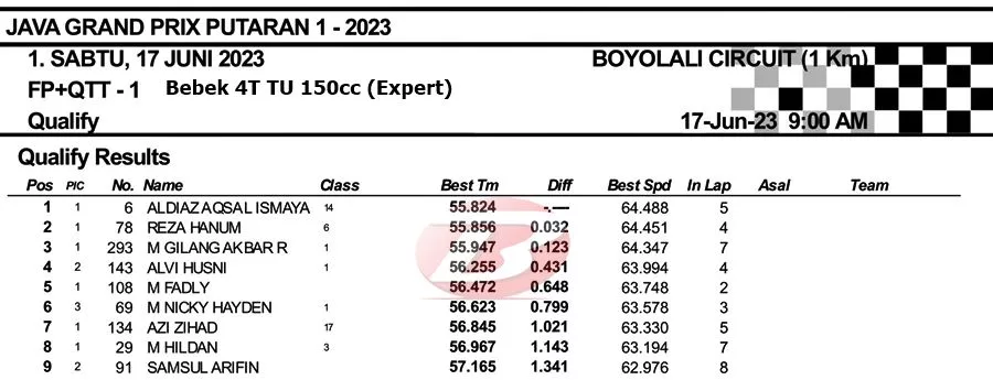 Sebut saja Reza Hanum, AM Fadly, Aldiaz Aqsal dan Alfi Husni. Nah, pada QTT sendiri Aldiaz sukses menjadi yang tercepat. Pembalap yang memacu MX-King PARD itu catatkan waktu 55,824 detik.