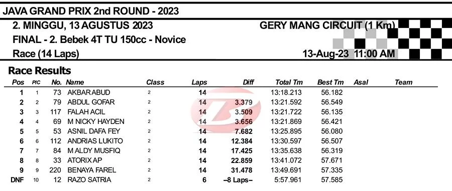 Juara di kategori Novice dengan Akbar Abud. Dia mendominasi sejak kualifikasi hingga final race. Tak tersentuh dan menang dengan meyakinkan.