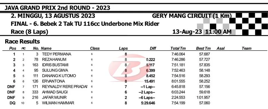 Tedy mampu meraih waktu yang konsisten sepanjang balapan. “Rezeki gak kemana, Alhamdulillah,” bilang pembalap asal Karawang yang mengawali balapan dari posisi ketiga.