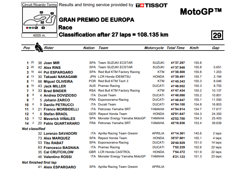 Berikut hasil selengkapnya dari MotoGP Eropa 2020