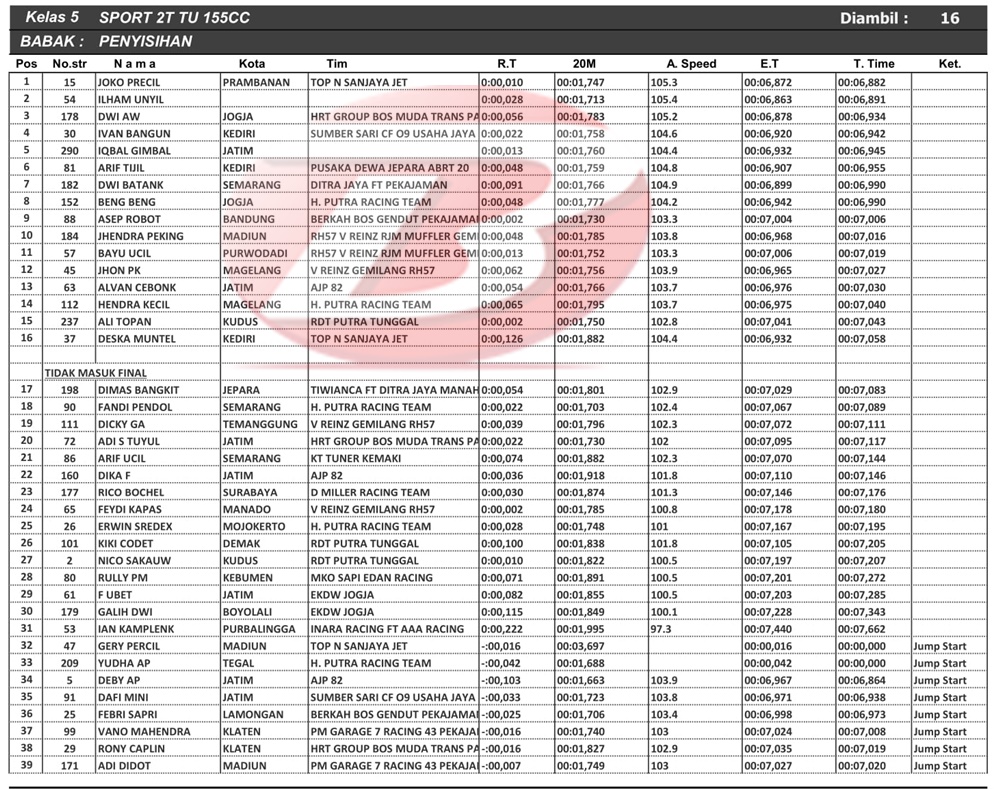 Pembalap asal Prambanan ini menorehkan waktu terbaik 6,882 detik. Joko lebih cepat dari Ilham Unyil, Dwi AW, Ivan Bangun dan Iqbal Gimbal di lima besar terbaik. Hanya Joko dan Ilham yang mencatat angka 6,8 detik sekian.