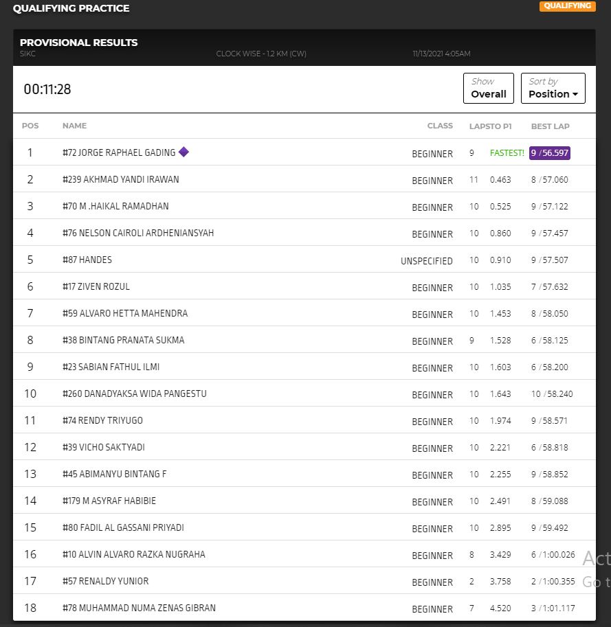 Jorge mampu menjadi yang tercepat dalam sesi QTT kelas Beginner dengan mampu menorehkan best time 56.597 detik. Pembalap asal Semarang ini mampu unggul jauh dengan pembalap di posisi kedua yaitu Akhmad Yandi Irawan (Borneo Jaya Motor) dengan gap time 0.436 detik.