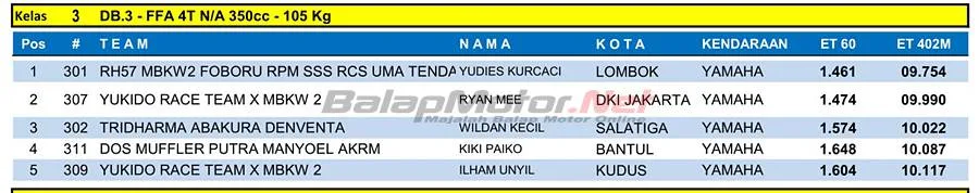 Adalah best time di kategori 402m. Yudies yang turun di kelas FFA 4T 350cc itu mencatat waktu terbaik 9,754 detik. Ini melampaui torehan Wildan Kecil di IDC Drag Bike Championship seri pertama 24 Maret lalu.