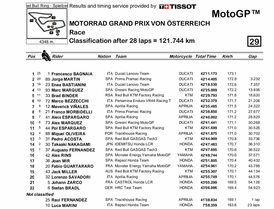 Sedangkan tiga besar dilengkapi Enea Bastianini. Rekan Pecco itu juga tampil begitu konsisten walaupun tanpa melakukan serangan kepada dua pembalap terdepan. Dengan tersebut, Ducati sukses besar di kandang KTM!