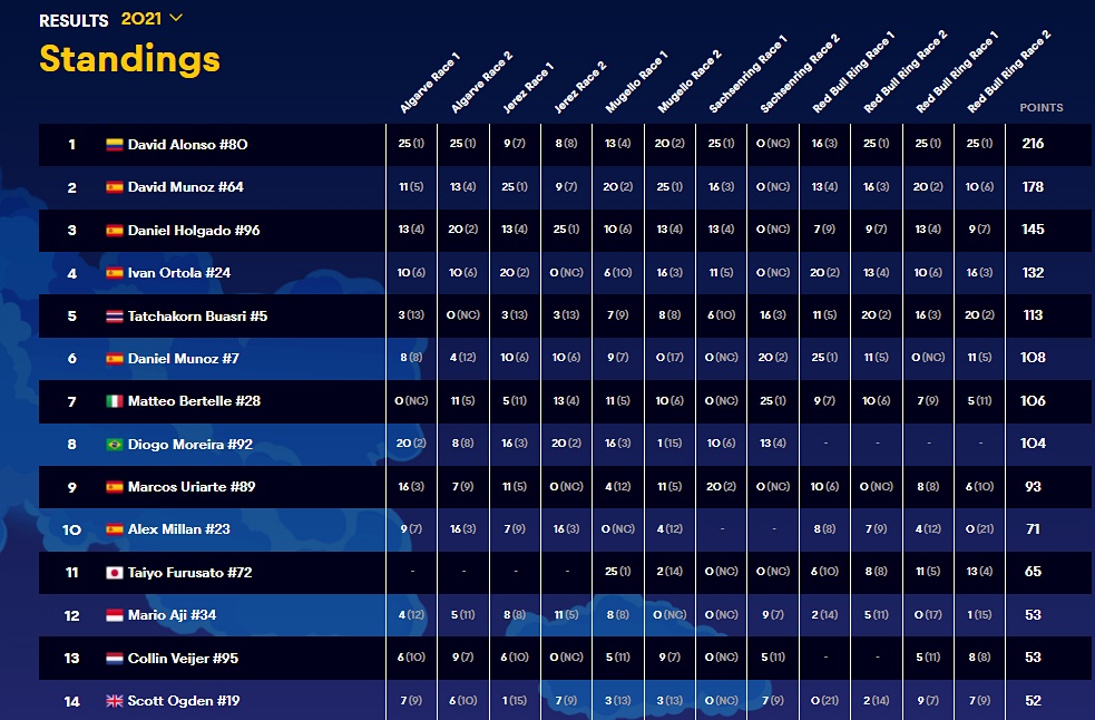 Mereka adalah duo David. Yaitu, David Alonso dari Colombia dan David Munoz asal Spanyol. Alonso saat ini memimpin dengan keunggulan 38 poin dari Munoz. Akan tetapi, masih ada dua balapan yang berarti merebutkan 50 poin.
