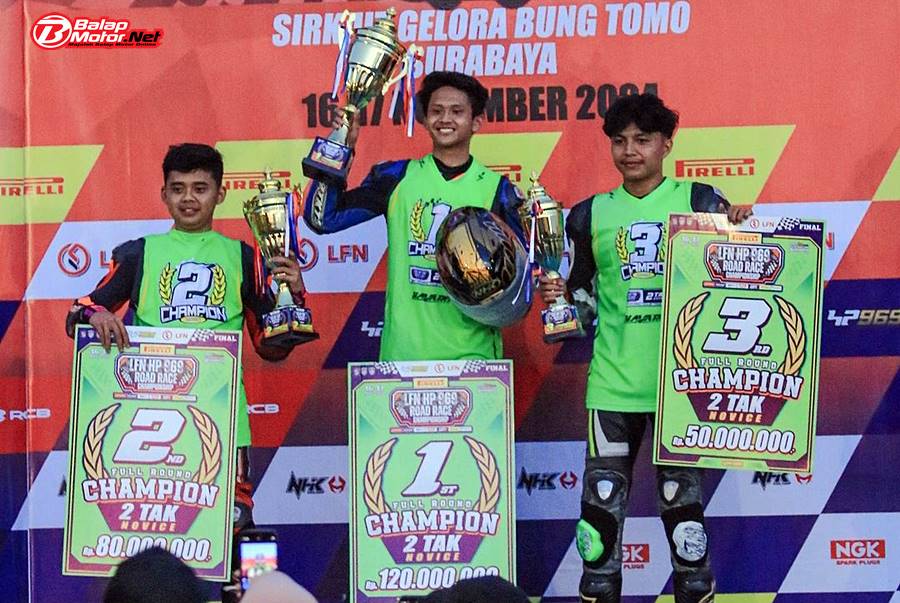 BalapMotor.Net – Hafidz Fahril Rasyadan, pebalap asal Probolinggo Jawa Timur berhasil menuntaskan diri sebagai raja bebek 2 tak novice gelaran spektakuler LFN HP969 Road Race Championship 2024.