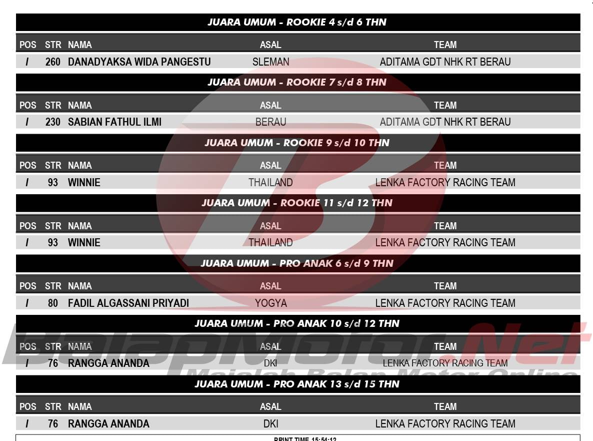 Rangga Ananda yang juga pembalap dari LENKA Factory Racing sendiri juga mampu merebut dua gelar juara umum yaitu pada kelas Pro anak 10-12 tahun dan Pro anak 13-15 tahun. Selamat kepada para pemenang!!!