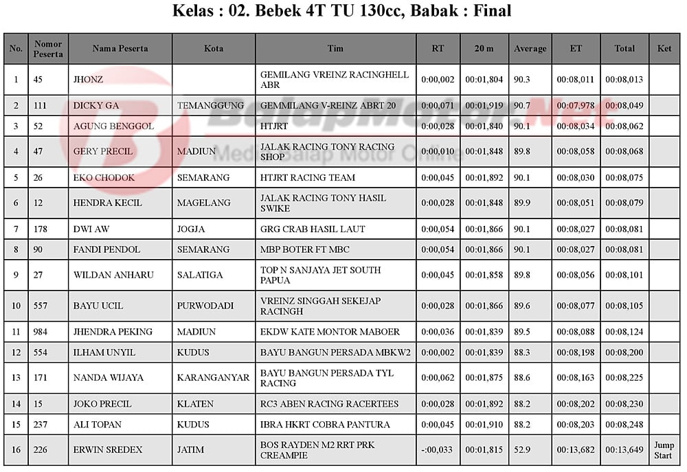 “Coba tampil tanpa beban saja, yang jelas berusaha tampil lebih baik dari saat penyisihan kemarin. Soal motor juga gak ada kendala, Alhamdulillah setelah sekian lama bisa mengantarkan motor ini di podium juara lagi,” ujar Jhon PK dengan logat Maduranya.