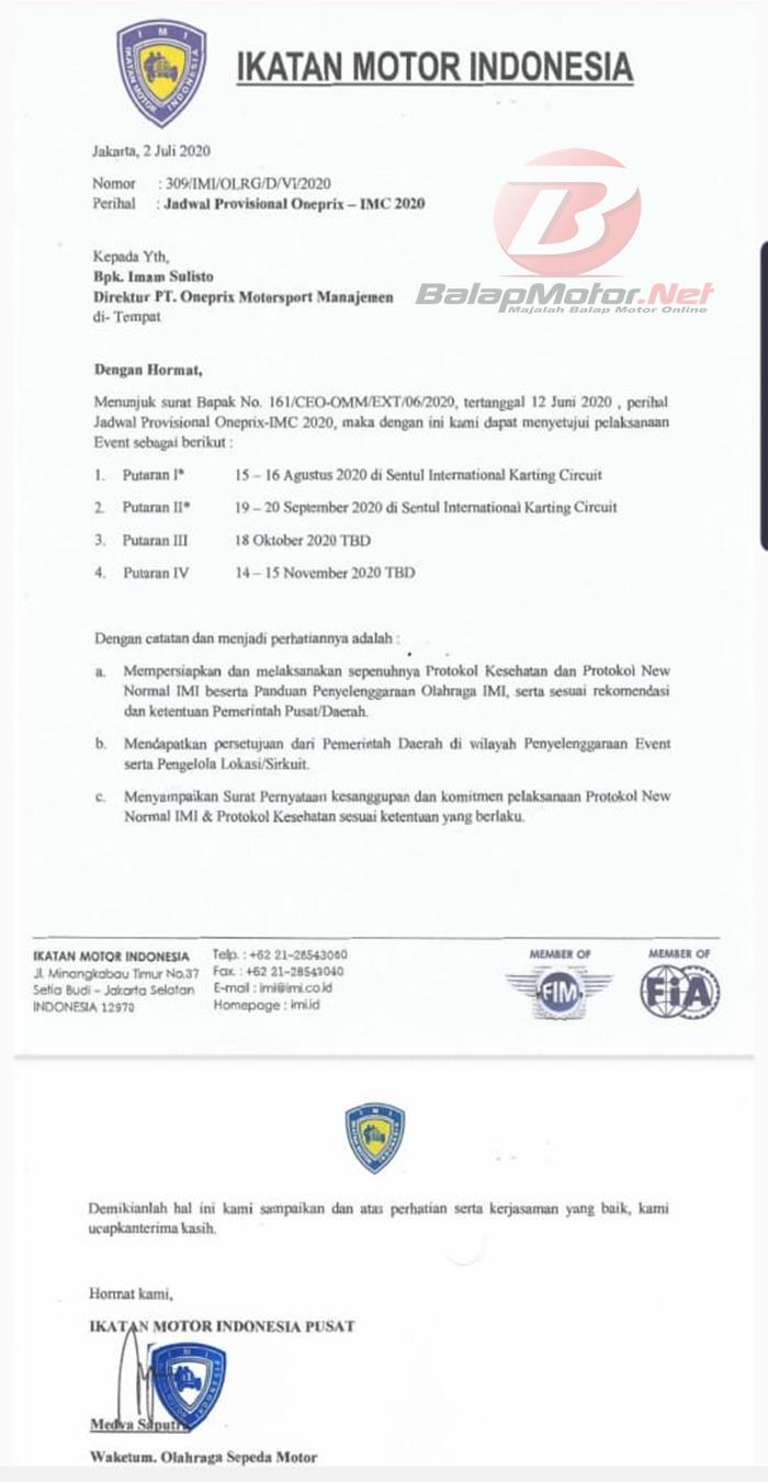 Berdasarkan surat nomor : 309/IMI/OLRG/D/VI/2020 yang ditujukan untuk Direktur PT OMM yaitu Imam Sulisto, disebutkan bahwa PP IMI menyetujui pelaksanaan event Oneprix dengan jadwal yang sebelumnya dirilis oleh OMM.