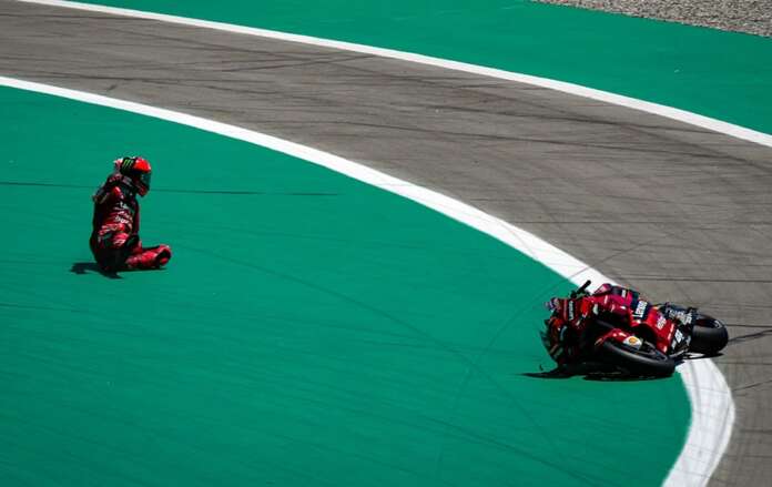 Tapi bukan sebab kesalahannya sendiri. Pecco tertabrak Takaaki Nakagami yang tergelincir. Yang juga membuat Alex Rins (Suzuki) ikut tidur di gravel. Bagnaia pun sangat kecewa dan sekarang tertinggal 66 poin dari Quartararo.