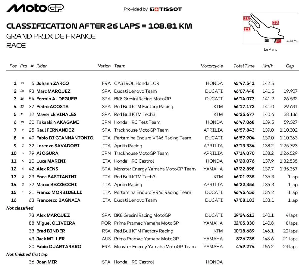 “Hujan mulai turun, dan saya ingin memberikan banyak tekanan pada beberapa putaran pertama. Saya menyelesaikan putaran panjang pertama dan masih dekat dengan Marc. Lalu tiba-tiba roda depan tergelincir, saya tidak menyangka hal itu,” ungkap Quartararo.