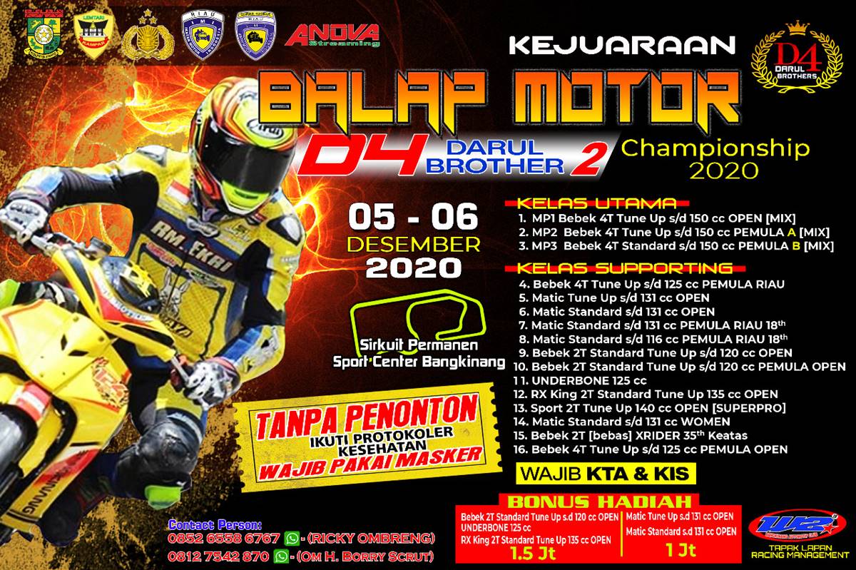 BalapMotor.Net – Sirkuit Sport Center Bangkinang, Riau akhirnya bakal kembali digelar event balap gaes. Event tersebut adalah Kejuaraan Balap Motor D4 DARUL BROTHERS Championship II 2020.