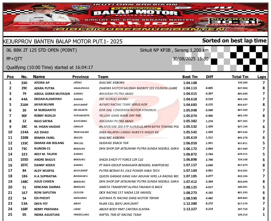 Palakunya Atorix AP. Pembalap kelahiran Purworejo itu menorehkan best time 1:04,108 detik. Itu dengan kondisi lintasan KP3B yang basah setelah diguyur hujan.