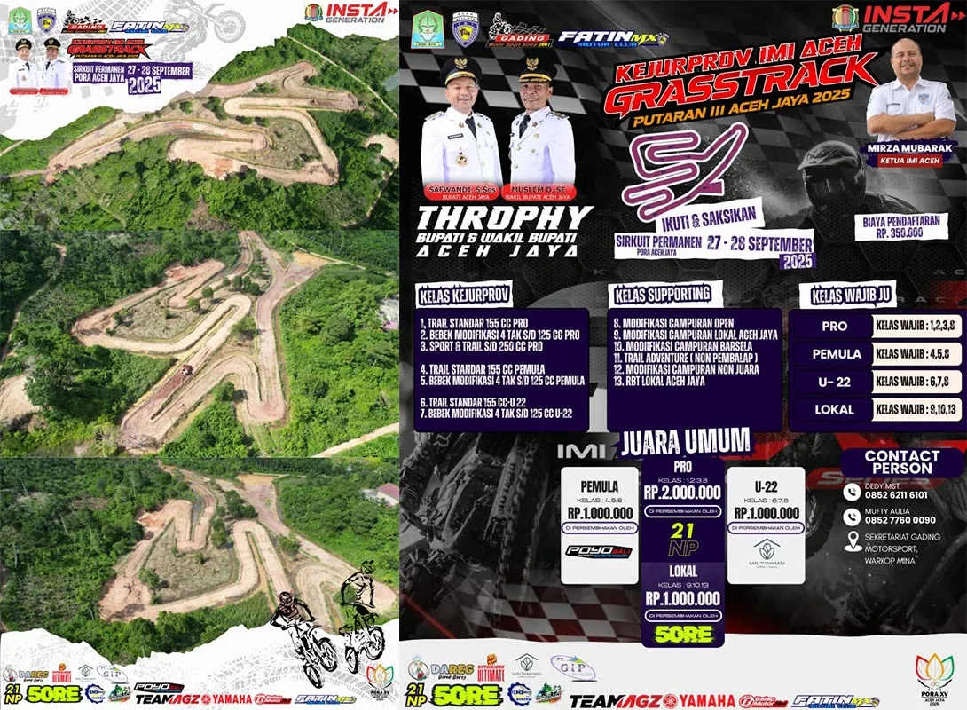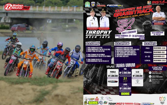 BalapMotor.Net – Ajang Kejurprov IMI Aceh Grastrack 2025 memasuki putaran ke-3 yang siap digelar akhir pekan ini, 27-28 September 2025, di Sirkuit Permanen Meureudam Daya, Calang, Kabupaten Aceh Jaya. Kejuaraan garuk tanah yang diinisiasi Gading Motosport x Fatin MX ini memperebutkan Piala Bupati dan Wakil Bupati Aceh Jaya, Safwadi, S.Sos dan Muslem D.SE.