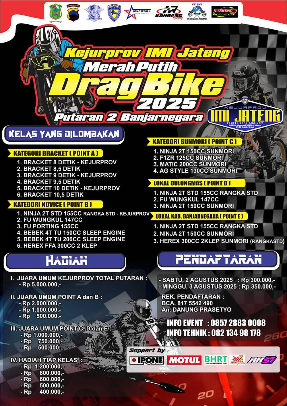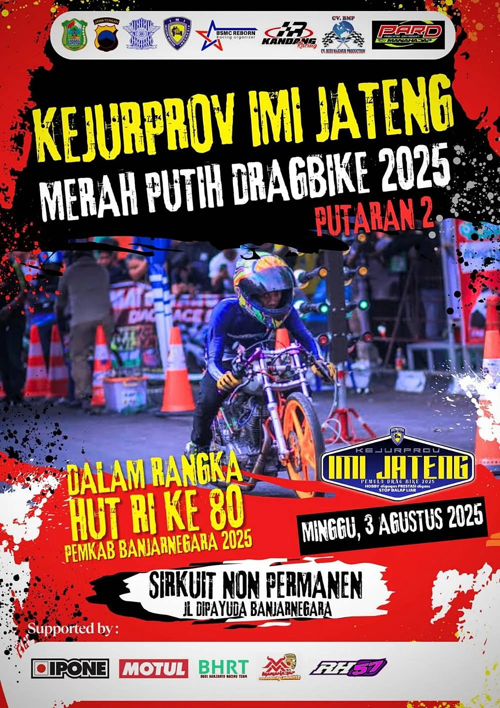 BalapMotor.Net – Ajang balap lurus bergengsi kembali hadir di Banjarnegara! Seri kedua Kejurprov IMI Jateng Marah Putih Drag Bike akan digelar pada Minggu, 3 Agustus 2025, di Sirkuit NP. Jl. Dipayuda, tepat di tengah kota Banjarnegara.