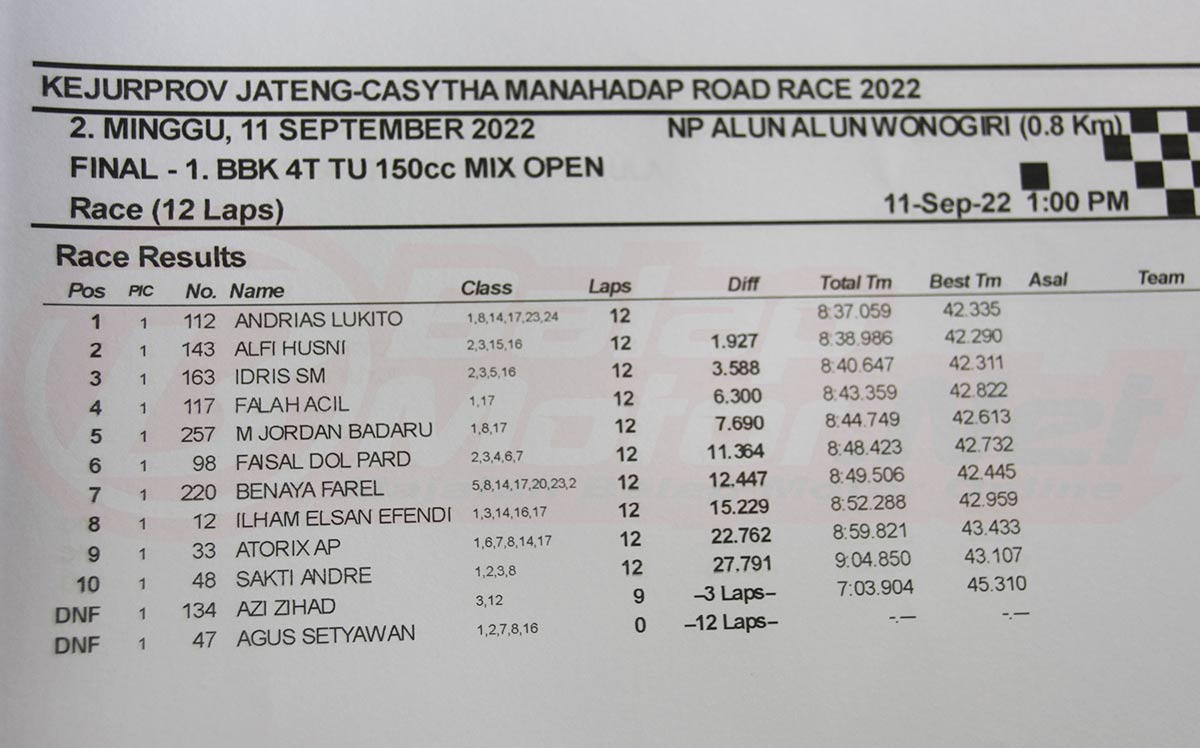 Sepanjang balapan, Andrias Lukito mampu konsisten menaklukan jalanan di sekitar Alun-Alun Giri Krida Bakti Wonogiri yang disulap menjadi sirkuit dadakan. MK Ramadhipa sendiri juga ternyata cukup mahir menaklukan trek dadakan yang sudah ditiadakan dalam Kejurnas.