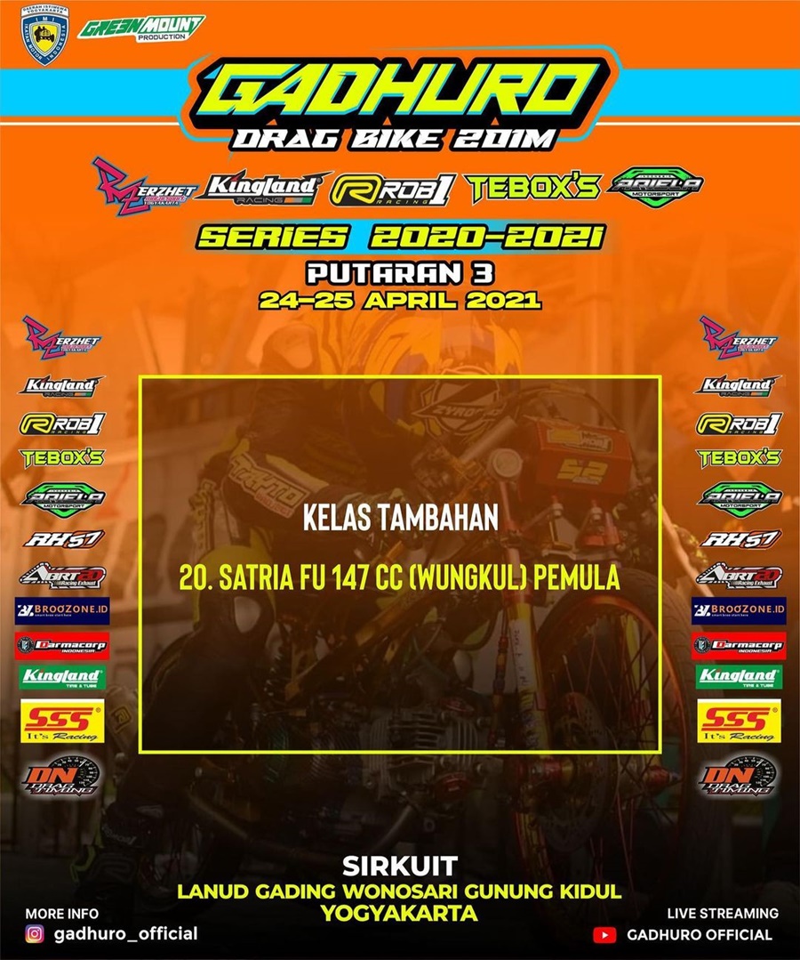Selain itu, terbaru ada tambahan kelas FU Wungkul. Kelas apa itu? Jadi kelas tersebut sudah akrab di wilayah Semarangan. Atau lebih tren diarena balap liar. Gadhuro coba buka kelas ini di Wonosari karena antusias peserta yang mulai banyak.