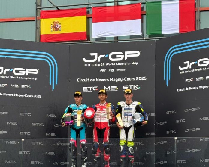 BalapMotor.Net – Pembalap binaan PT Astra Honda Motor (AHM) kembali cetak sejarah untuk Indonesia. Setelah sebelumnya Veda Ega Pratama menang di RedBull Rookies Cup (RBRC) Italia, saat ini giliran M. Kiandra Ramadhipa yang tampil memukau dalam gelaran FIM JuniorGP World Championship yang berlangsung di sirkuit Magny-Cours, Prancis pada 5-6 Juli 2025. M. Kiandra Ramadhipa berhasil melaju kencang dan mencetak sejarah dengan meraih podium tertinggi dalam race pertama balap European Talent Cup (ETC). Raihan Ramadhipa sekaligus menjadi prestasi pertama pembalap Indonesia di balapan bergengsi benua Eropa ini.