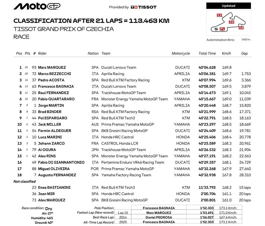 BalapMotor.Net – Marc Marquez (Ducati Lenovo Team) meraih kemenangan pada hari Minggu di Grand Prix Tissot Ceko, menjadikannya pembalap Ducati pertama yang memenangkan lima Grand Prix secara beruntun.